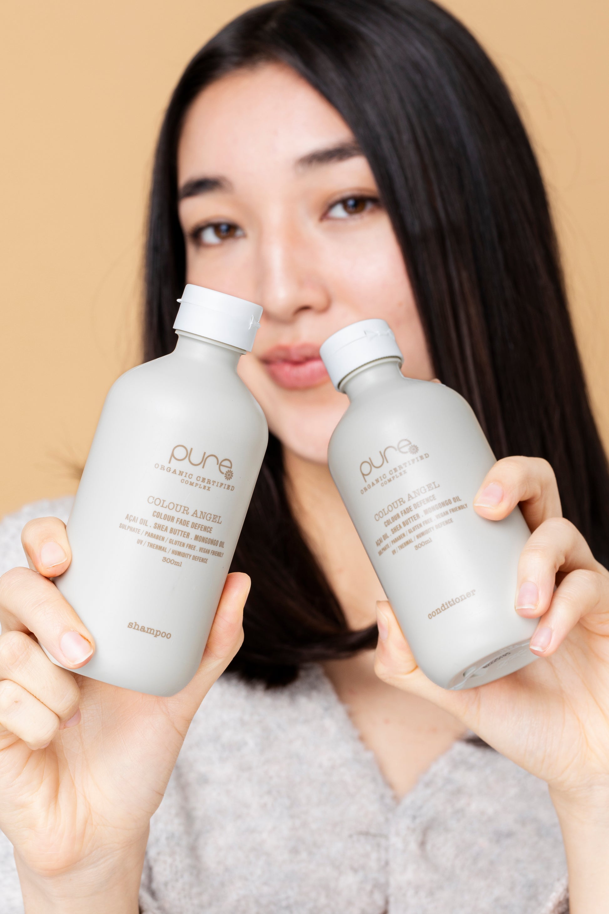 PURE COLOUR ANGEL CONDITIONER with exclusive ‘pure complex’TM (certified 100% organic extracts) conditions all coloured hair while locking in colour and shine.