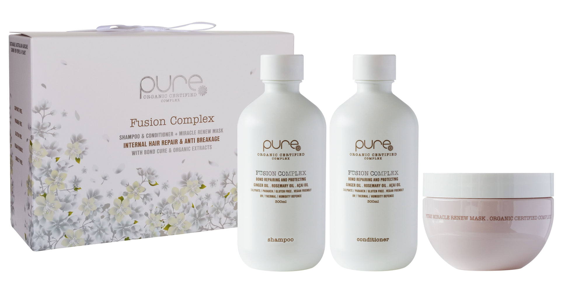 PURE FUSION COMPLEX shampoo with bond building technology and exclusive ‘pure complex’TM (certified 100% organic extracts) protects, strengthens and repairs damaged hair from chemical salon processes.